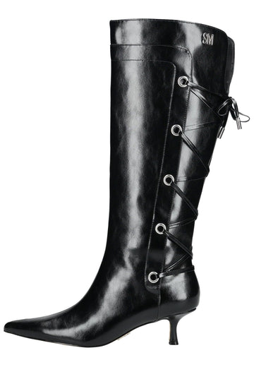 This exclusive women's boot combines feminine elegance with a modern design. The pointed cut and narrow heel create a sophisticated silhouette, while the side lacing details with metal eyelets add a sophisticated touch. The high shaft visually elongates the leg, making the boot the perfect companion for stylish outfits. Whether with dresses, skirts, or elegant trousers – this boot makes a fashion statement.
