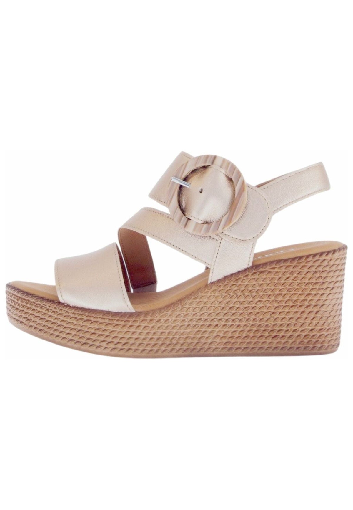This stylish wedge sandal from Gabor, made of high-quality nappa leather, is guaranteed to be a real eye-catcher. The adjustable strap can be individually adjusted to your foot using the practical hook-and-loop fastener. The Best Fitting System, with its wider tread, ensures maximum comfort. Whether worn with a breezy summer dress or casually rolled-up jeans, this shoe is versatile.