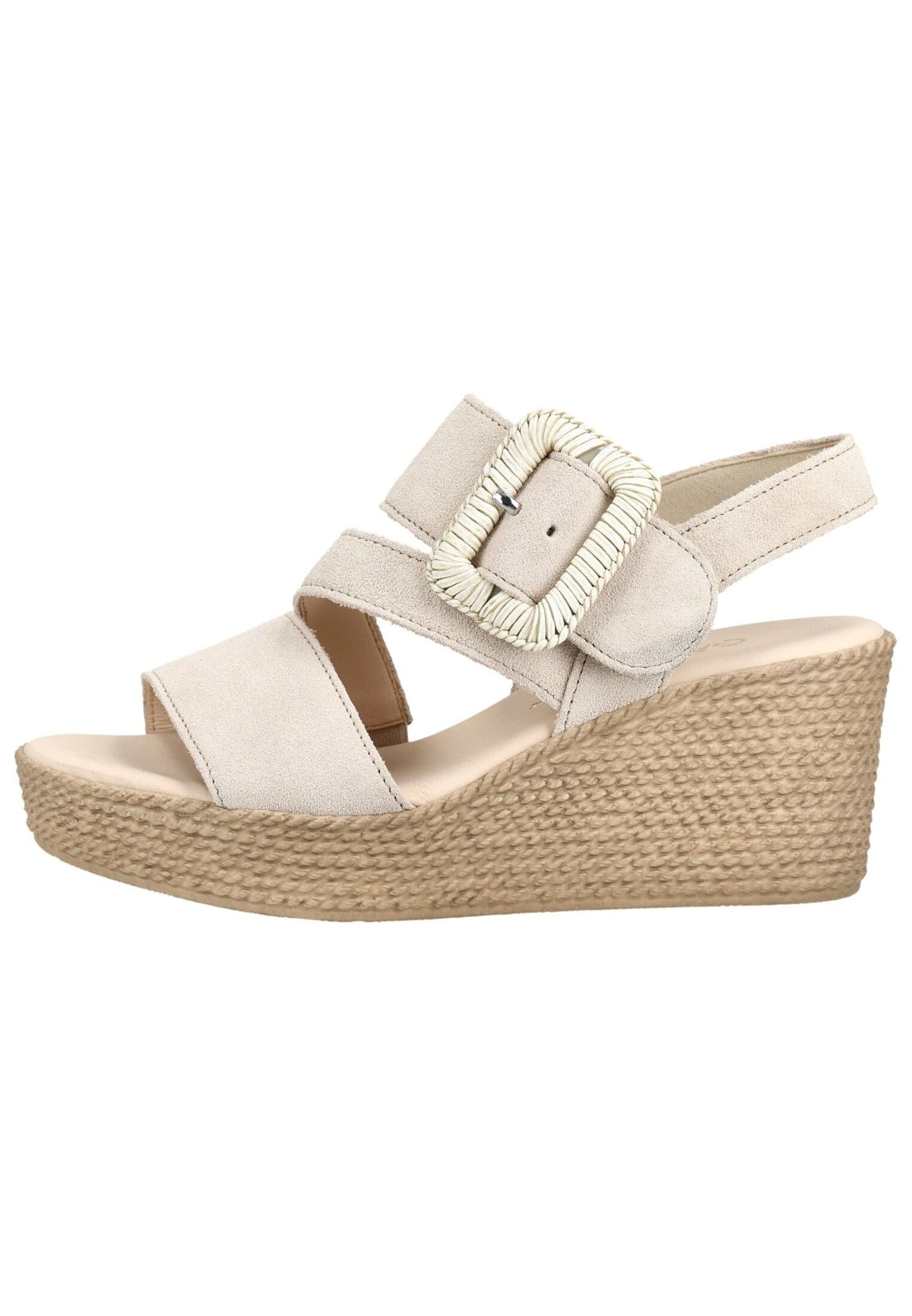 This elegant wedge sandal from Gabor impresses with its harmonious combination of modern design and exceptional comfort. The high-quality suede gives the sandal a sophisticated, natural look and a pleasantly soft feel. The wide straps provide excellent support, while the adjustable heel strap allows for a customized fit. A striking, decorative woven-look buckle adds a stylish and trendy touch. The comfortably padded insole ensures a pleasant walking experience, even on long days. The design is completed by the expressive wedge sole with its textured surface, which not only adds visual interest but also provides stability and a comfortable heel height. Perfectly paired with summer dresses, lightweight trousers, or casual jeans – a versatile companion for warm days.