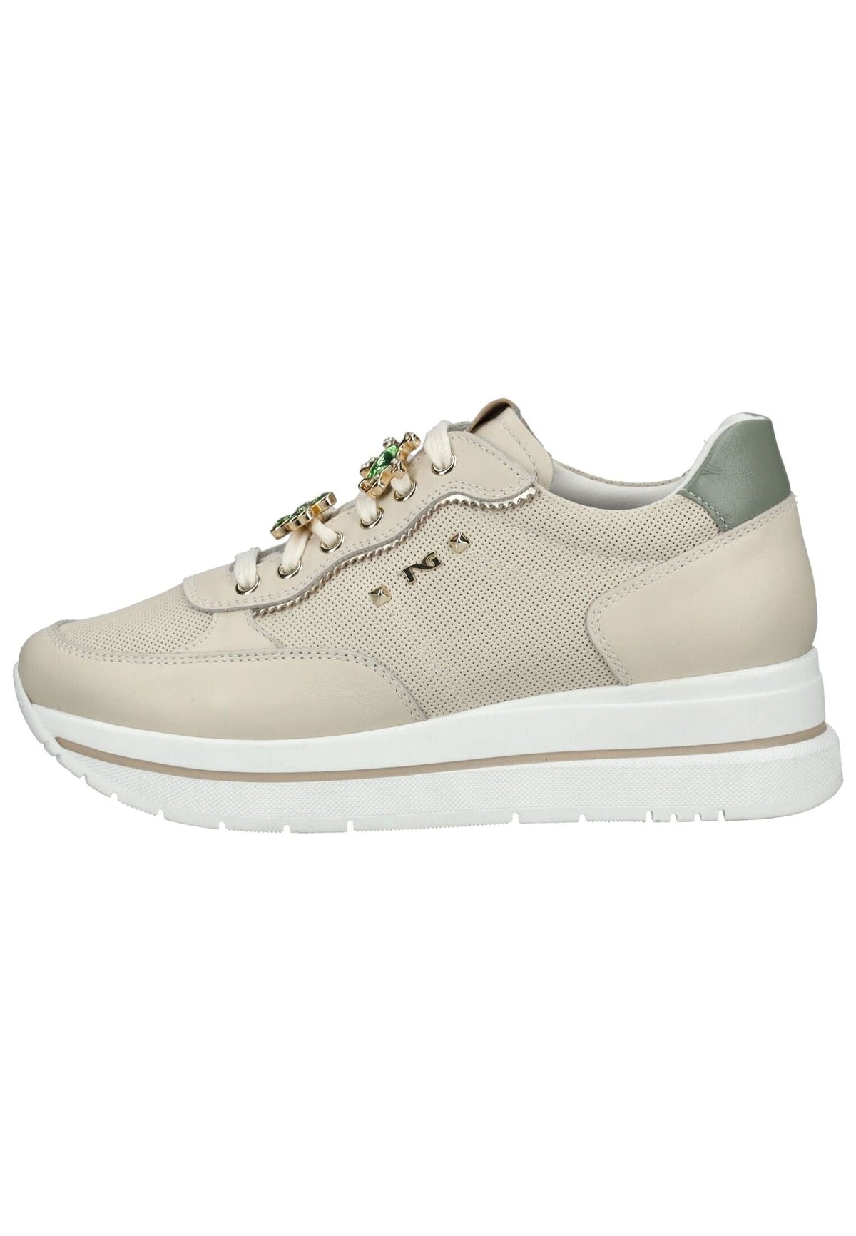 This elegant sneaker from NeroGiardini makes a stylish statement, combining luxurious design with exceptional comfort. The finely perforated upper, paired with smooth sections, creates a sophisticated look, while sparkling embellishments on the lacing add a special, feminine touch. Subtle logo details underscore its premium character. The classic lacing system ensures a perfect fit. For maximum comfort, the sneaker features a removable insole, making it ideal for custom orthotics. The lightweight, softly cushioned platform sole provides comfortable support with every step, making this shoe the perfect companion for stylish everyday and leisure looks.