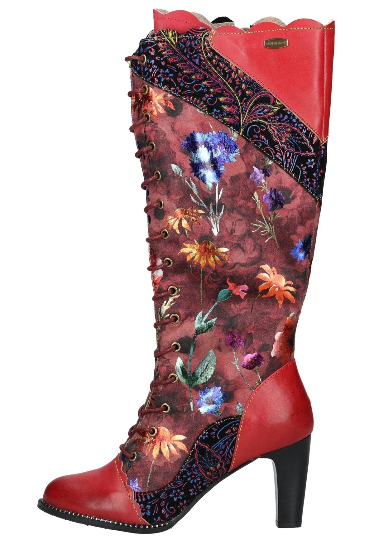 These elaborate boots from Laura Vita combine a colorful floral design with elegant lacing. The upper material displays a harmonious interplay of floral patterns and embellished fabric details, making these boots a true highlight for simple outfits. The lacing and side zipper make them easy to put on and individually adjustable. The feminine heel stylishly completes the extraordinary design.