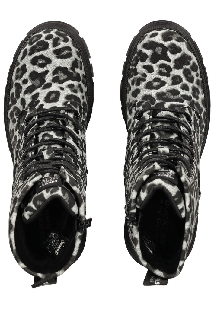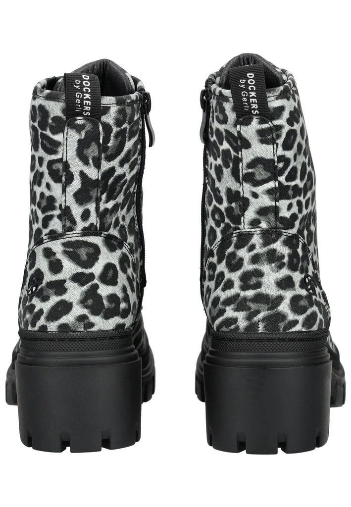 Striking women's lace-up ankle boots with a fashionable animal print and a sturdy treaded sole. The extravagant design makes a bold statement, while the classic lacing and side zipper ensure a secure and comfortable fit. Thanks to the soft, warm lining, the shoe is ideal for cold days and offers a high level of comfort. The sturdy outsole completes the trendy overall look and makes these boots the ideal companion for fashion-conscious looks in the cold season.