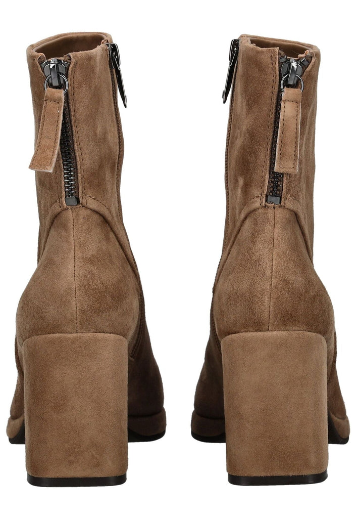 A high-heeled ankle bootie from Regarde le Ciel that captivates with its elegant look, further emphasized by the black decorative zipper and block heel. This shoe is crafted from black Delice leather and features accentuated stitching along the shaft.