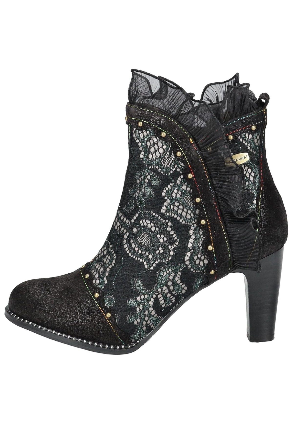 This Laura Vita ankle boot captivates with its striking design and is sure to draw attention! An ornate floral pattern combined with playful ruffles lends the shoe an enchanting, baroque charm. The comfortable funnel heel and flexible rubber sole complete the stylish look. You'll feel special and stylish in this exceptional Laura Vita ankle boot!