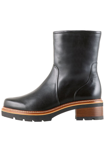 This modern ankle boot combines stylish design with functional comfort. The soft, warm lining provides a pleasantly warm feel during the colder months. The removable footbed allows for the use of custom insoles, offering additional flexibility. The robust, treaded sole and stable block heel ensure a secure stance. With its simple, elegant look, this ankle boot is perfect for both everyday and business outfits.