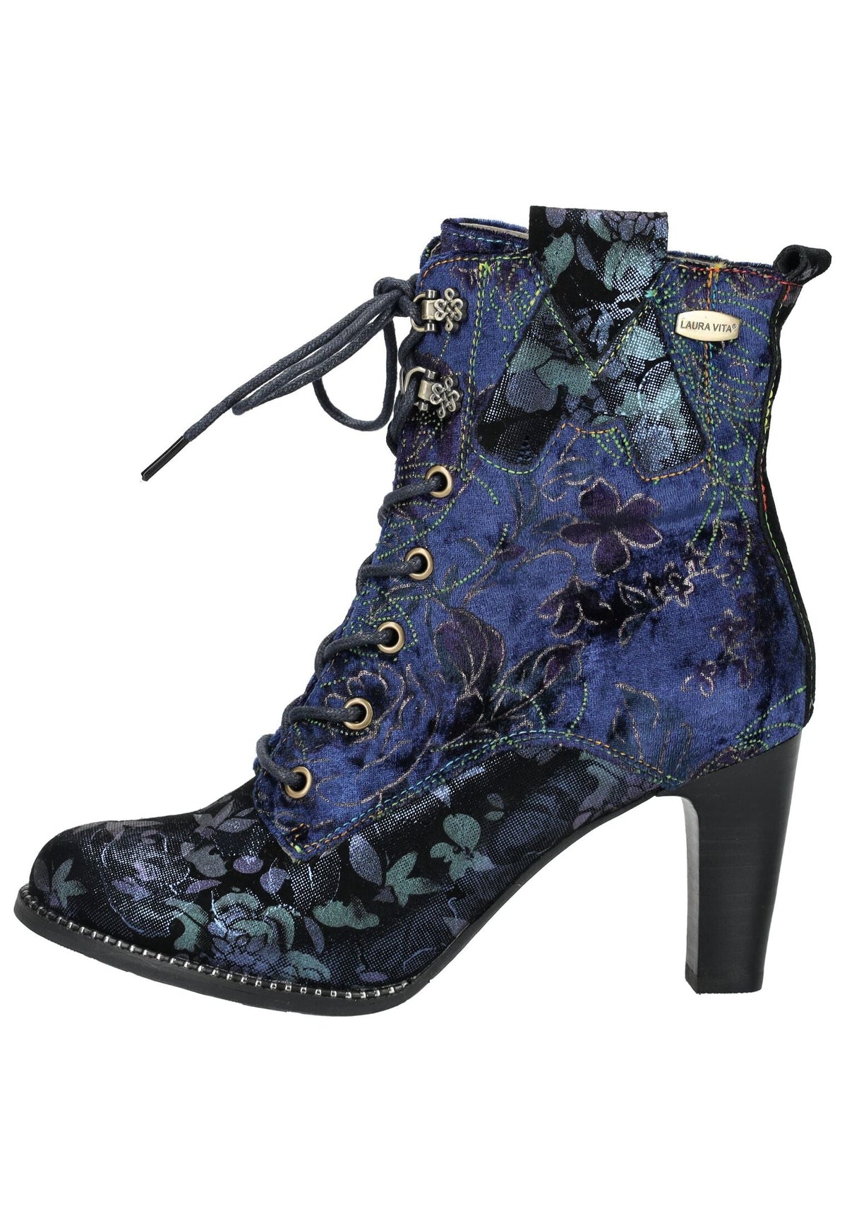 These fashionable ankle boots from Laura Vita are sure to turn heads. This elegant model will elevate even the simplest outfit. The suede upper is further accentuated by floral appliqués and colorful stitching. The side zipper allows for effortless slip-on, while the strap on the shaft adds visual sophistication, and the lacing ensures optimal support.