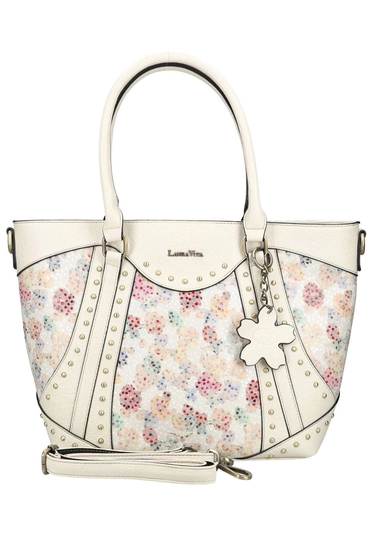 This vibrant handbag from Laura Vita impresses with its unique design and charming details. The base material is complemented by a playful, colorful floral pattern, giving the bag a special flair. Decorative studs and contrasting inserts add a modern touch. Thanks to the sturdy handles and detachable shoulder strap, the bag can be carried in a variety of ways – either by hand or comfortably over the shoulder. A stylish companion that adds a fresh accent to any outfit.