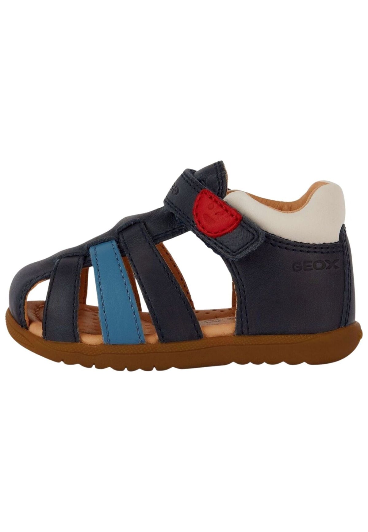 This breathable yet functional first-step sandal from Geox, featuring a padded insole and reinforced toe and heel caps, is perfect for active kids and perfectly supports their boisterous romping. This playful and colorful shoe also features a practical hook-and-loop closure and high-quality leather.