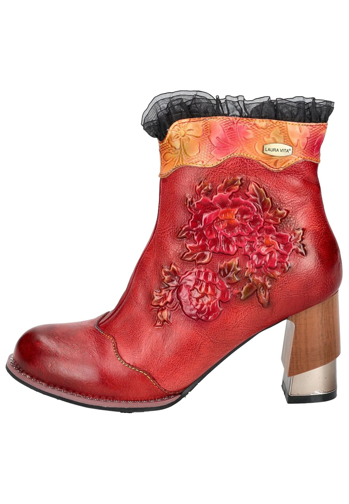 This striking ankle boot from Laura Vita, crafted from high-quality leather, is a guaranteed highlight in your wardrobe. The charming ruffles on the shaft add a unique touch to the style. The inside zipper allows for comfortable and easy entry.