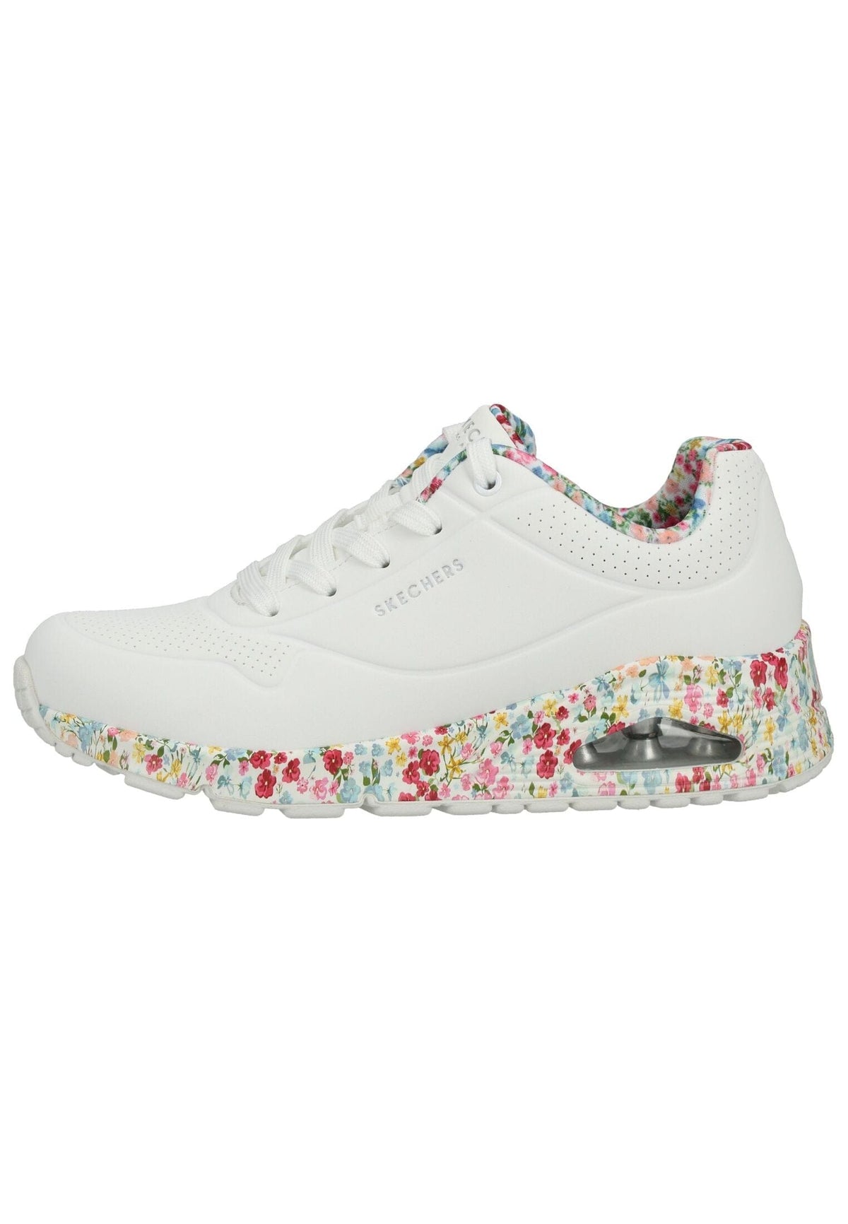 This Skechers sneaker combines sporty comfort with a fashionable design. The upper boasts a clean look, subtly enhanced by perforations and logo details on the side. Inside, a colorful floral lining adds a special touch. The classic lacing system allows for a customized fit, while the softly padded collar enhances comfort. A particular highlight is the striking midsole with integrated cushioning that provides pleasant shock absorption with every step. The flexible outsole ensures a comfortable walking experience, making this Skechers sneaker a trendy companion for everyday wear and leisure activities.